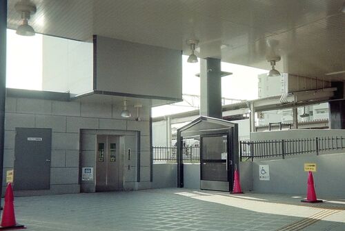 改札口前を通る自由通路のエレベーターと車いすユーザーがホームに行くためのスロープ通路が設けられているJR郡山駅(奈良県・大和郡山市 1997年撮影) ☞アシトドのブログのメニュー画面 へ 車椅子電車評論家・アシトド松井 駅が橋上改札化され改札口の前…