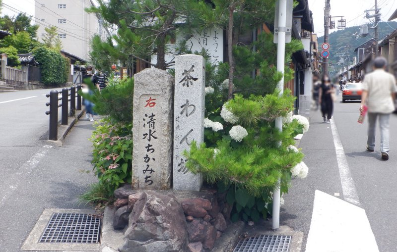 五条坂は自動車も多く歩道も狭くて、車椅子では大変でした。少し行くと五条坂と清水新道(茶わん坂)の分岐点がありました。