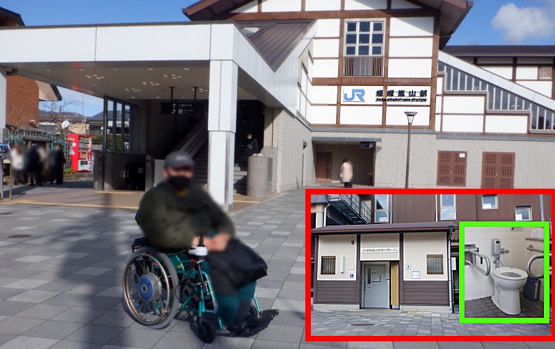 著者の記録によれば、JR嵯峨嵐山駅がバリアフリー化されたのは平成20年、それまでは車椅子用のスロープ通路が別にあったと地元の方に伺っています。エレベーターや車椅子・オストメイト対応フル規格トイレ(改札口内)完備。駅前の公衆トイレに車椅子対応トイレが設けられていました。