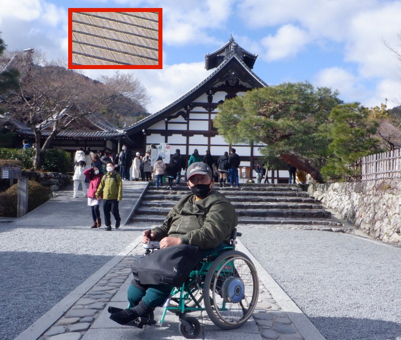 写真左側の大きなスロープ通路を上がって左側すぐに参拝受付があります。このスロープ通路以前は滑り止めのためか鉄の板で凸凹がつくられており(赤のカッコ内のような凹凸)。車椅子で上がろうとすると前輪が引っかかったりガタガタした振動が伝わり、拝観をためらう車イス仲間も少なくありませんでした。現在は凹凸のない通路に改善されており、車いすでの天龍寺拝観がより良いものになりました。