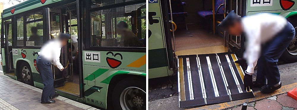 京福バスさんが運行されていた「すまいる」という路線バスがノンステップでしたので乗せてもらいました(2002年の状況です)
