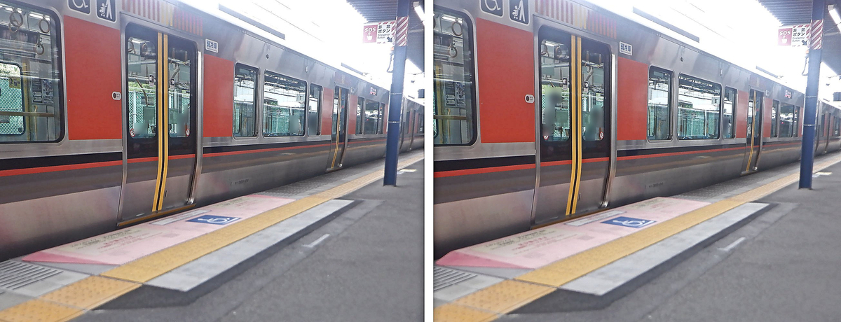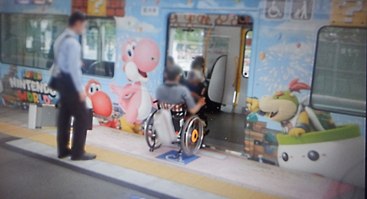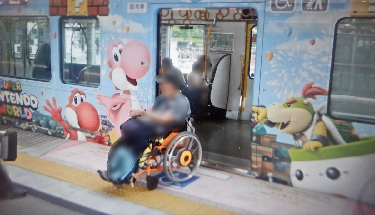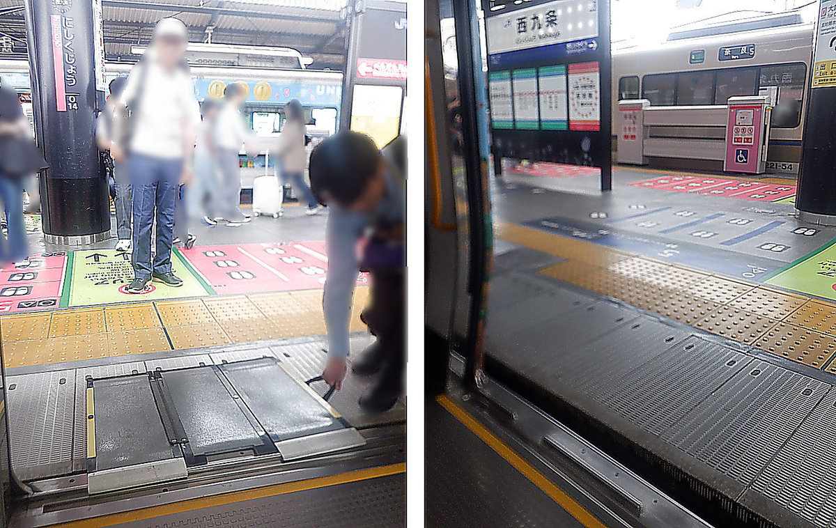 JR桜島駅に到着したところ駅員さんが「車いす用渡し板」を設置して下さいました。可動スロープの位置ではありませんでした。駅員さんに大阪・関西万博よりも可動スロープの体験のためJR桜島駅に電車を乗り継いでやってきたのです、と告げると車いすでの可動スロープ乗降体験にお付き合いして下さいました。