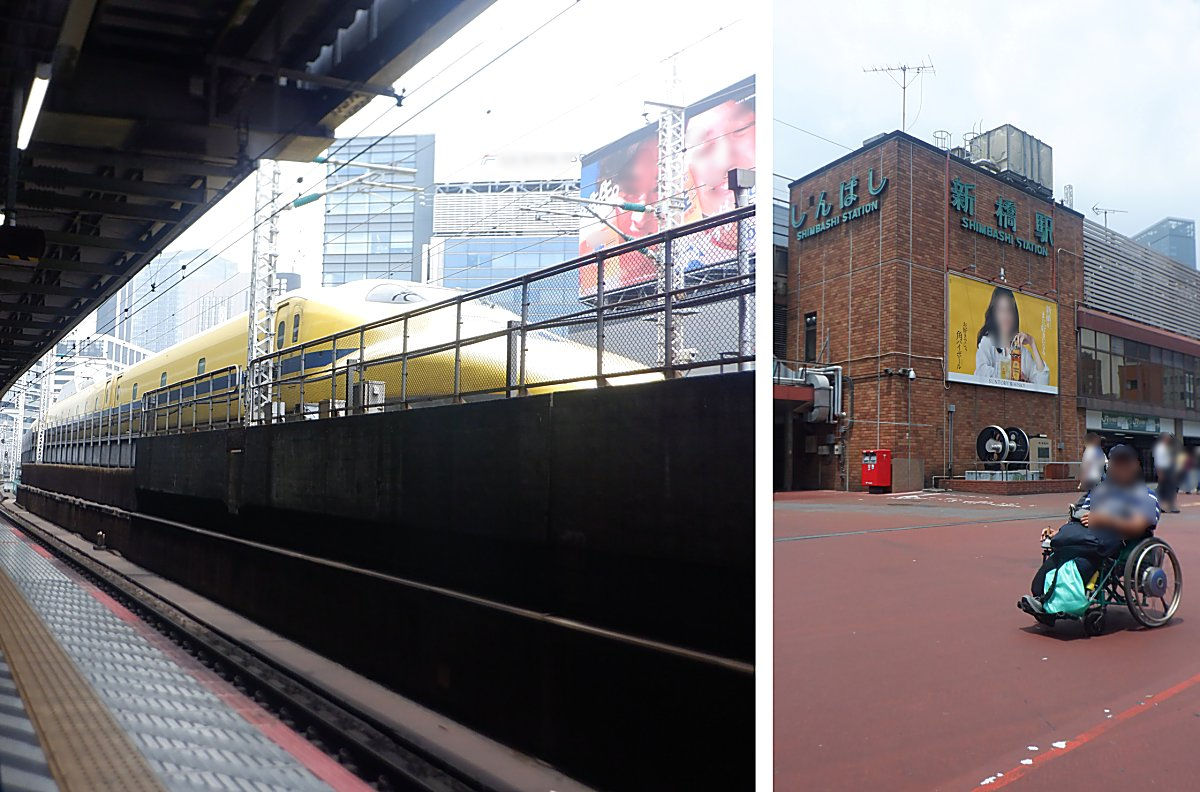 乗車予定の電車の到着時間までに何気なく新橋駅ホームより一段高い場所を眺めると黄色い列車が進んでゆく。