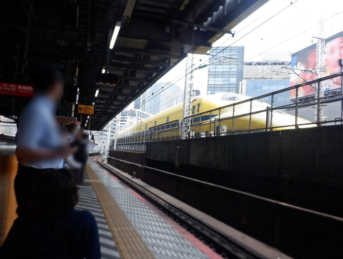 品川~東京間の新幹線はゆっくり走行、車窓ごしに平行する在来線ホームの乗客と目があうのではと思えるほどの低速です。